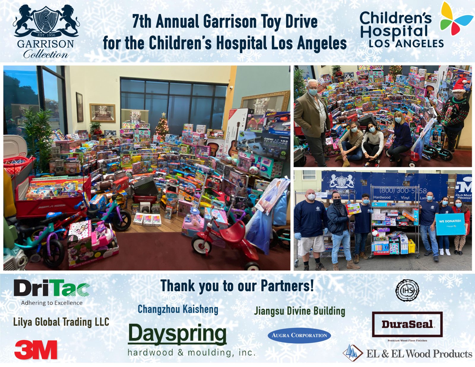 This year was extraordinarily important to bring holiday cheer to CHLA. Many of these children are quarantined from their families, their friends, and each other. We would like to thank all our partners who have helped us in making these donations possible: Dayspring, DriTac, El & El Wood Products, Indiana Hardwood, Augra Corporation, 3M, Lilya Global Trading, Changzhou Kaisheng, and Jiangsu Divine Building.